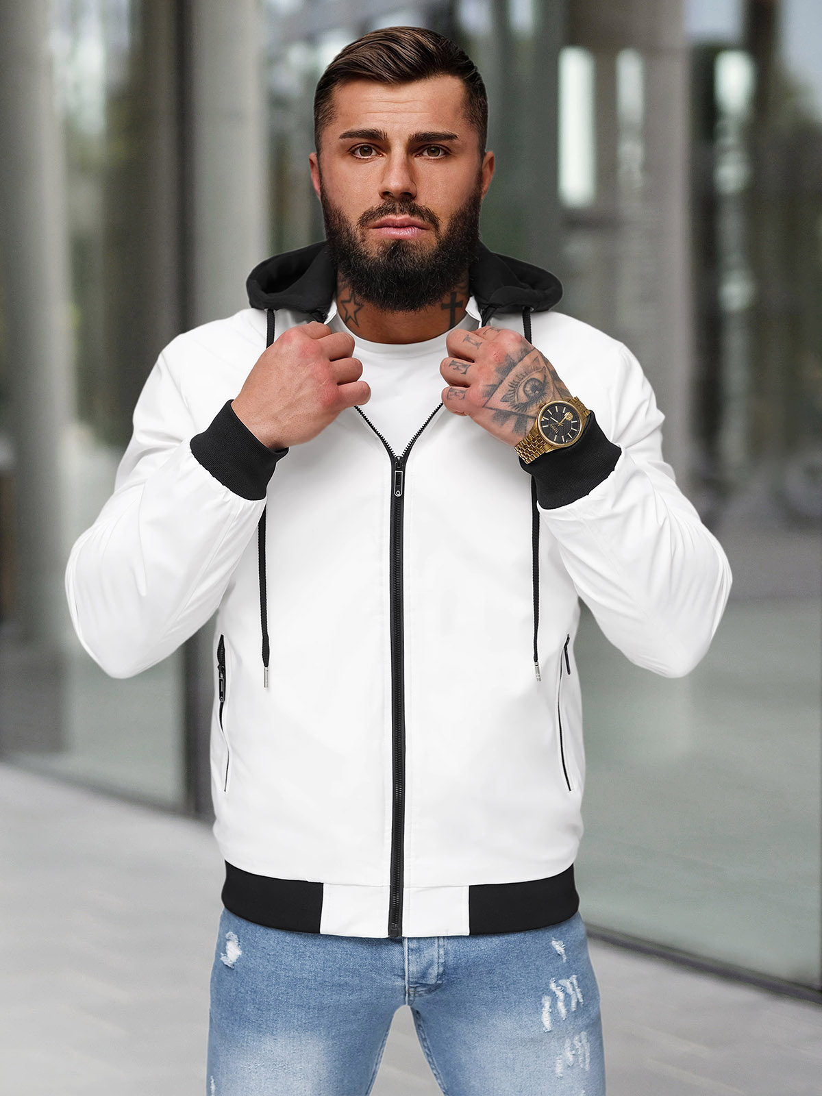 - Le modèle (182 cm, 87 kg) porte la taille XXL/54.
